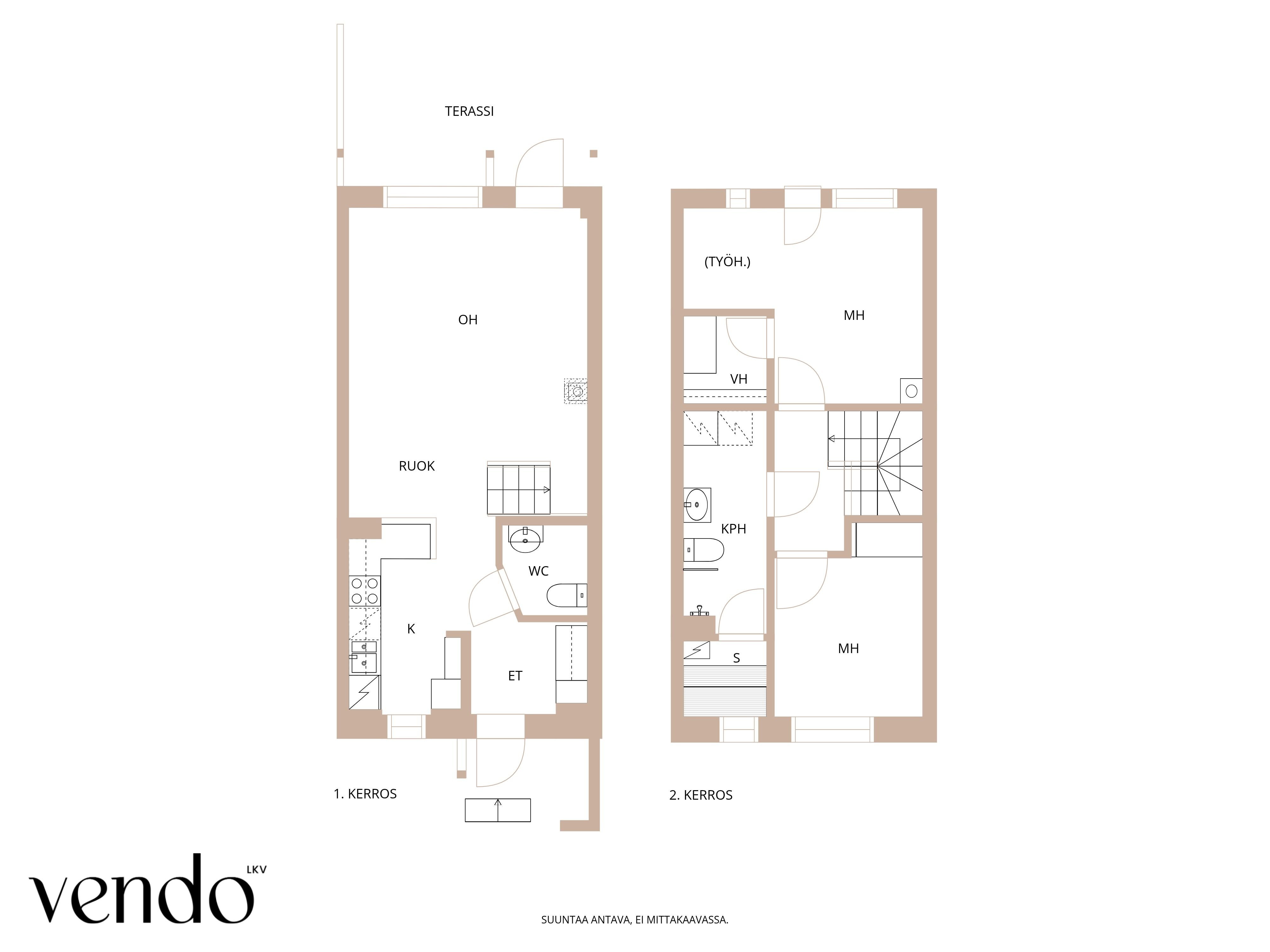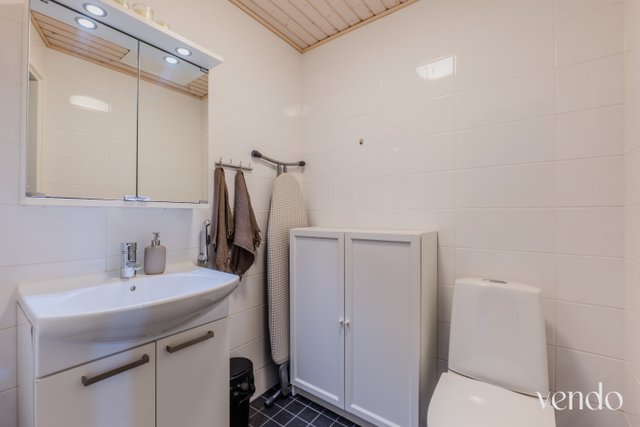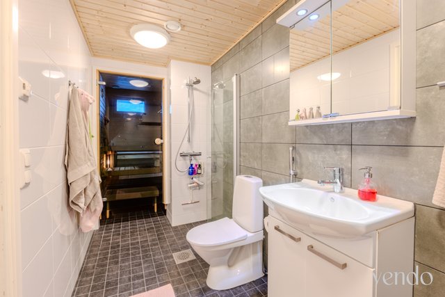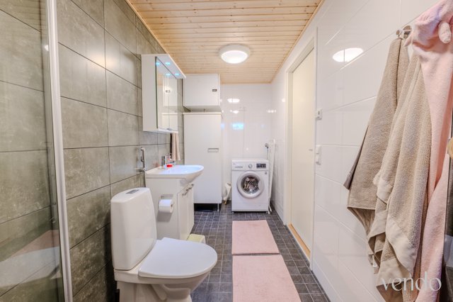 - WC-istuin, suihku, suihkuseinä, pesukoneliitäntä, lattialämmitys, peilikaappi, peili, pesuallas, allaskaappi, ja bidee-suihku