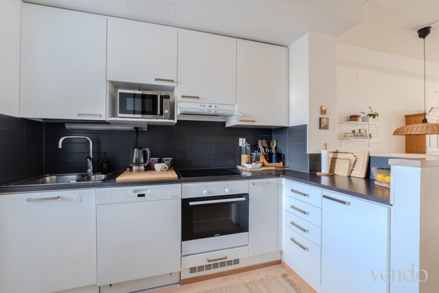 - Jääkaappipakastin, uuni, liesi, liesituuletin, ja astianpesukone