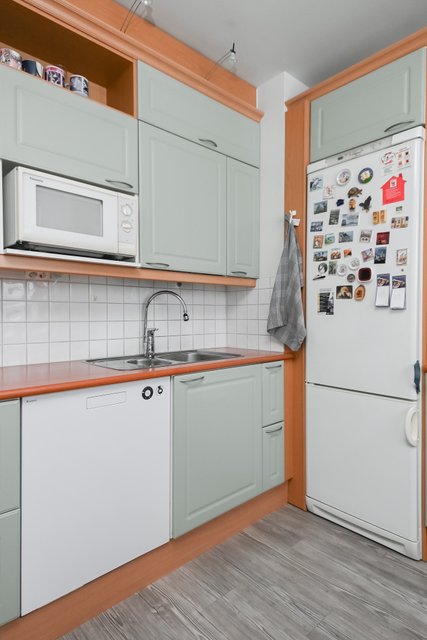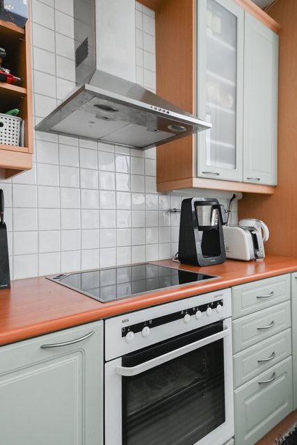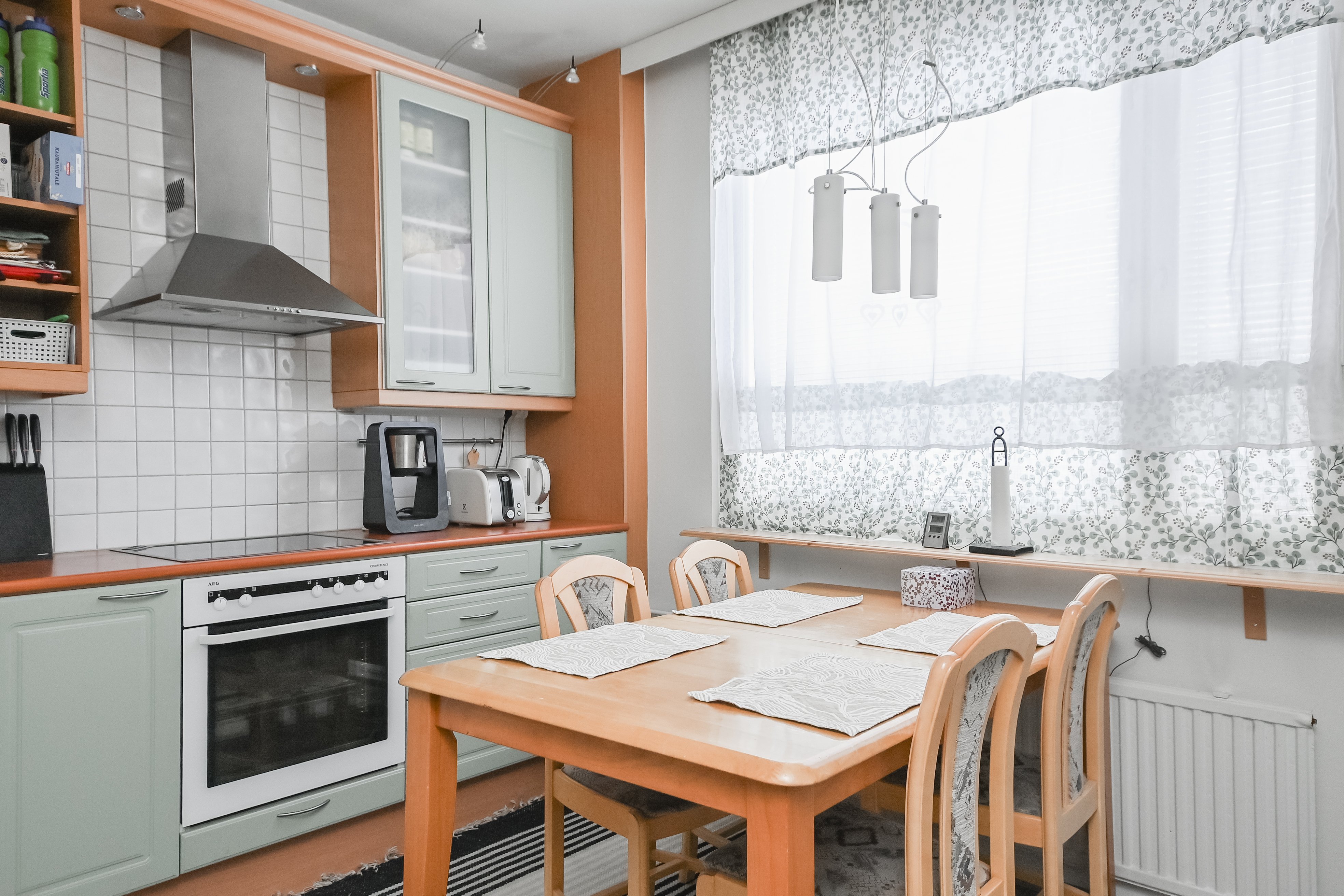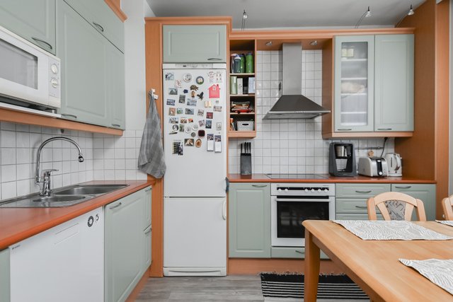 - Jääkaappipakastin, liesituuletin, astianpesukone, uuni, ja liesi