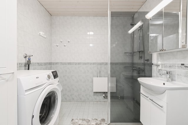 - WC-istuin, bidee-suihku, allaskaappi, peilikaappi, pesuallas, suihkuseinä, pesukoneliitäntä, lattialämmitys, ja suihku