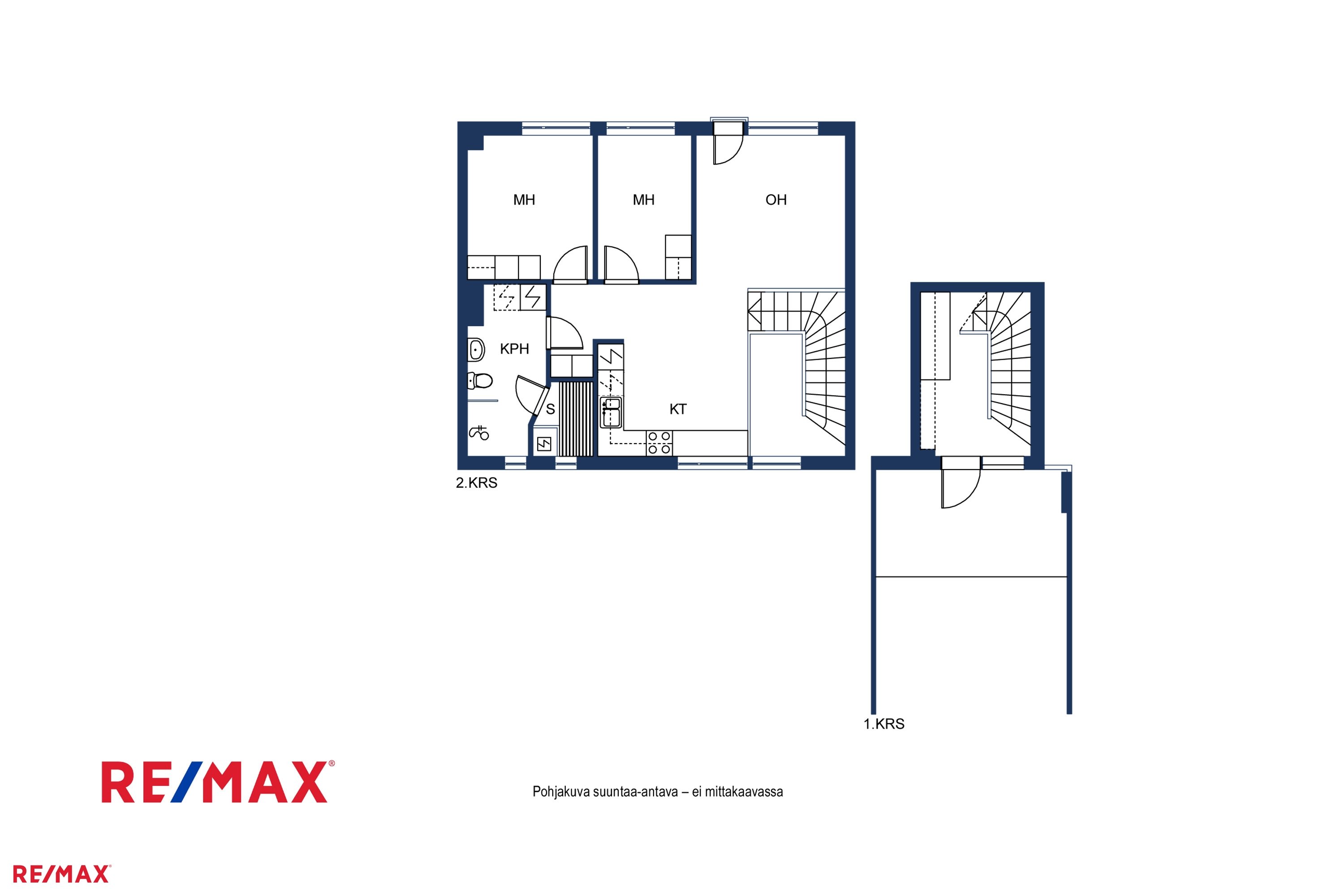 Kotiin tullaan ensimmäisen kerroksen eteisen kautta ja varsinaiset asuintilat ovat toisessa kerroksessa. Keittiö on tilava ja olohuone on järkevästi sen vieressä, mutta ei aivan tisikivuorien näköyhteyden päässä.