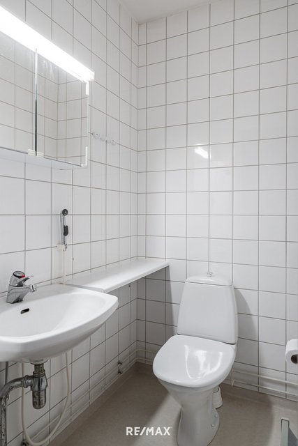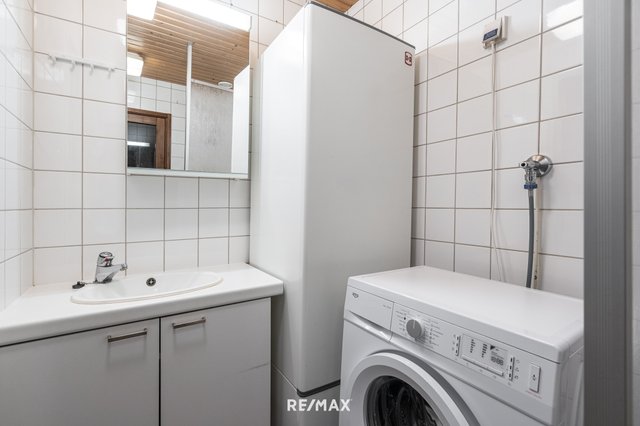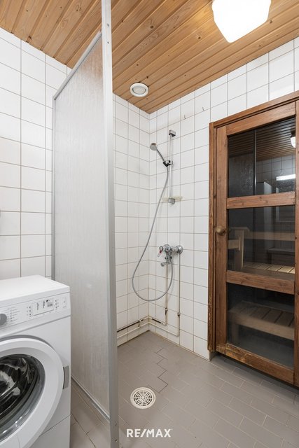 - Suihku, suihkuseinä, pesukoneliitäntä, lattialämmitys, peilikaappi, pesuallas, ja allaskaappi
