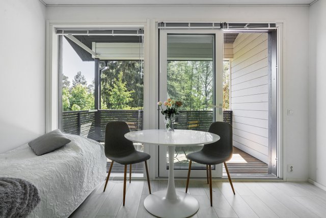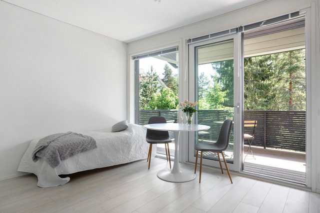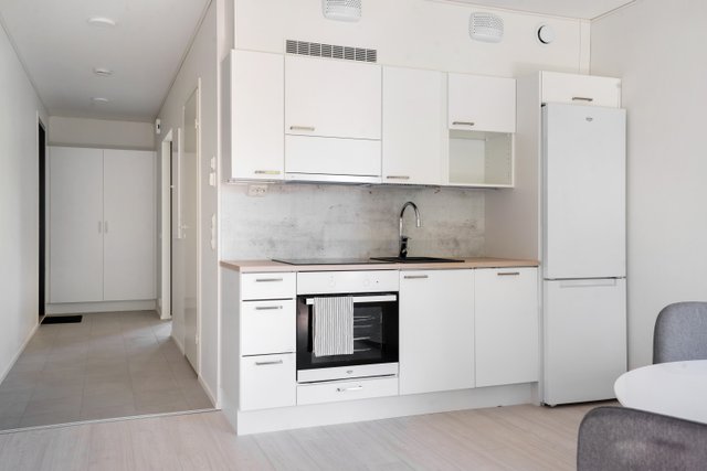 Kompakti mutta tyylikäs keittiö yhdistyy saumattomasti olohuoneeseen, ja kokonaisuus jatkuu tilavalle, etelään suuntautuvalle parvekkeelle – täydellinen paikka nauttia kesäpäivistä ja rauhallisista aamuhetkistä. Parvekkeelta avautuu näkymä sekä auringon nousuun että laskuun, joten saat nauttia valosta ja tunnelmasta aamusta iltaan. Makuuhuone sijoittuu omalle puolelleen tarjoten levollisen paikan rentoutumiseen. Tilavassa kylpyhuoneessa on ikkuna, joka tuo tilaan miellyttävää luonnonvaloa, ja siellä on myös käytännöllinen nurkkaus kodinhoitoa varten.