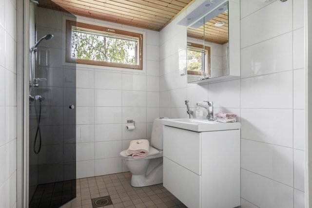 - WC-istuin, suihku, suihkuseinä, pesukoneliitäntä, pesuallas, peilikaappi, lattialämmitys, ja bidee-suihku