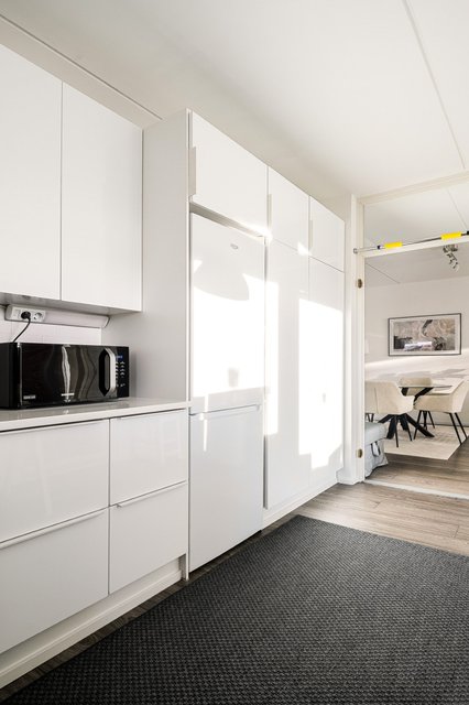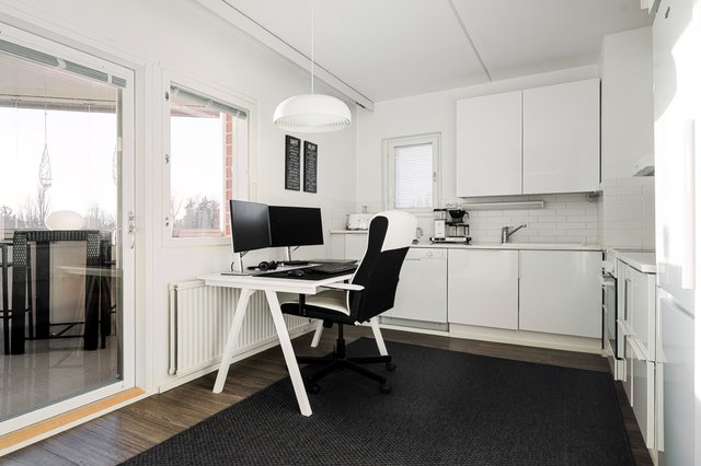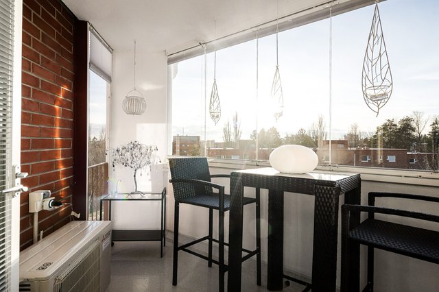 Modernista ja toimivasta keittiöstä on suora käynti upealle, etelään suuntautuvalle lasitetulle parvekkeelle. Kuvittele itsesi nauttimassa aamukahvista tai rentoutumassa ilta-auringossa ihaillen avaria näkymiä yli Vallikallion kattojen – tämä parveke on kuin ylimääräinen huone lähes ympäri vuoden.