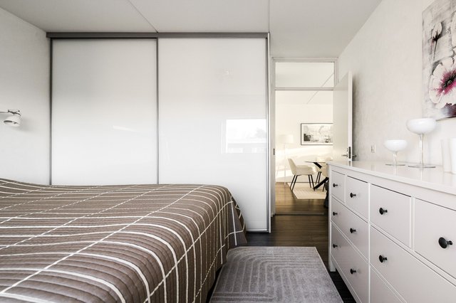 Tilavassa makuuhuoneessa on runsaasti säilytystilaa tyylikkäiden liukupeiliovellisten kaapistojen ansiosta.