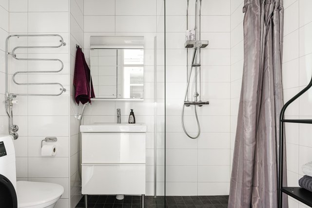 Tyylikäs ja toimiva kylpyhuone kruunaa kokonaisuuden.