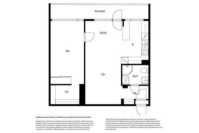 - Huoneiston pinta-alaa ei ole mitattu SFS5139 (Rakennuksen pinta-alat) määriteltyä huoneistoalan laskemisjärjestelmää käyttäen, huoneiston todellinen pinta-ala saattaa siis poiketa oleellisestikin yhtiöjärjestyksessä ilmoitetusta huoneiston pinta-alasta.