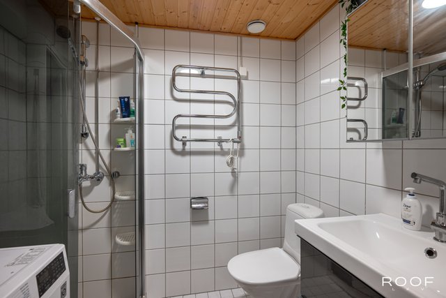 - SEINÄ:laatta LATTIA:kaakeli VARUSTEET:pesukoneliitin,allas,wc, peilikaappi, allaskaappi, lattilämmitys, suihkuseinä, suihku