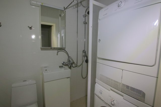 - WC-istuin, suihku, kuivausrumpu, pesukone, peilikaappi, pesukoneliitäntä, ja suihkuseinä