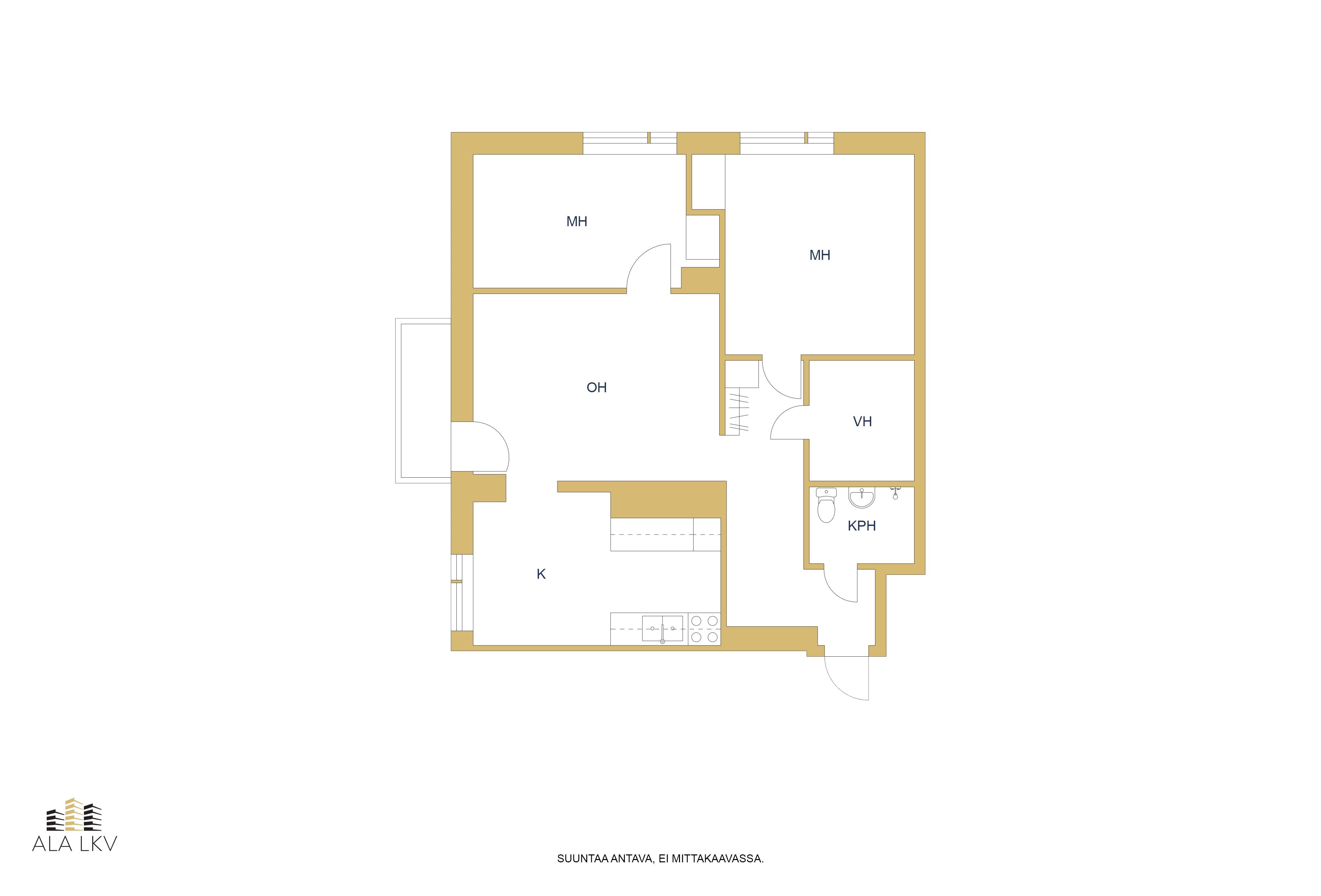 Asunnossa on kaksi makuuhuonetta, tilava olohuone sekä moderni keittiö, jossa on kaikki tarvittavat varusteet. Kylpyhuone on tyylikkäästi laatoitettu ja sieltä löytyvät sekä pesukone että kuivausrumpu. Asunnon parveke tarjoaa ihanan paikan nauttia aamukahvista tai ilta-auringosta.
