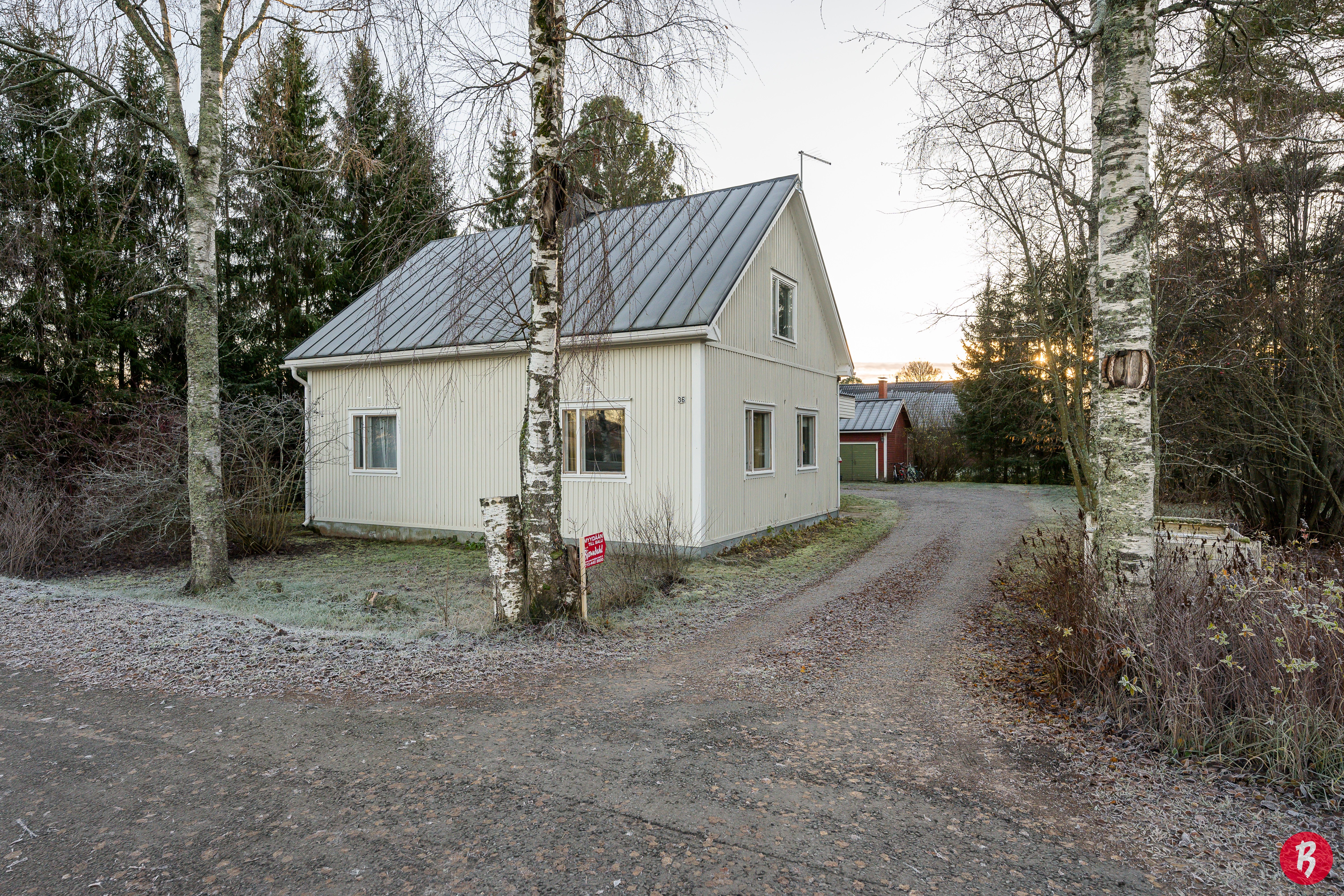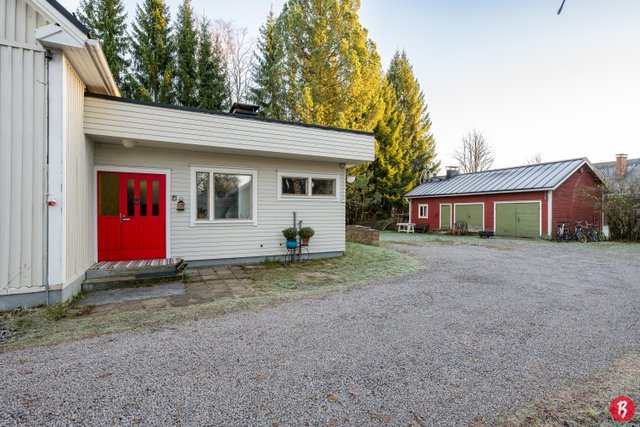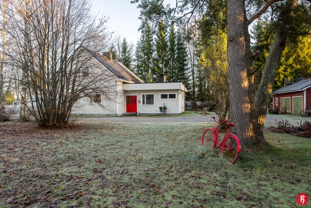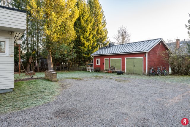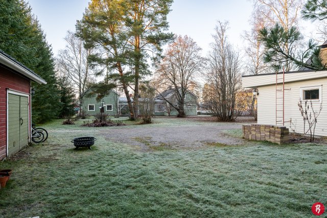 Puutarhamainen ja perinteikäs tontti on isojen puiden reunustama ja suojaisa, eikä kesällä tieltä juuri näe pihalle. Ulkorakennuksessa on vanha ja tunnelmallinen ulkosauna sekä pieni talli.