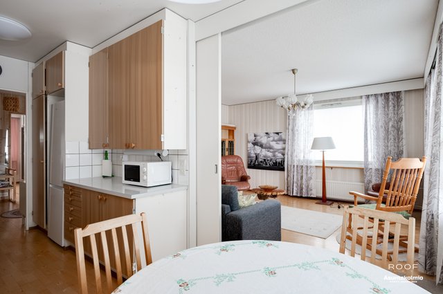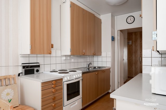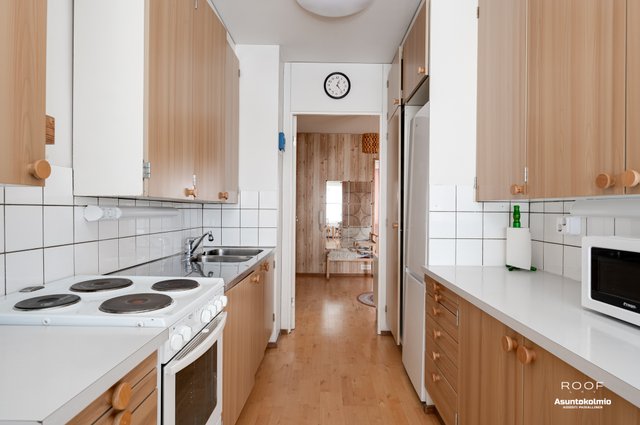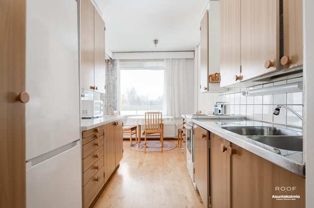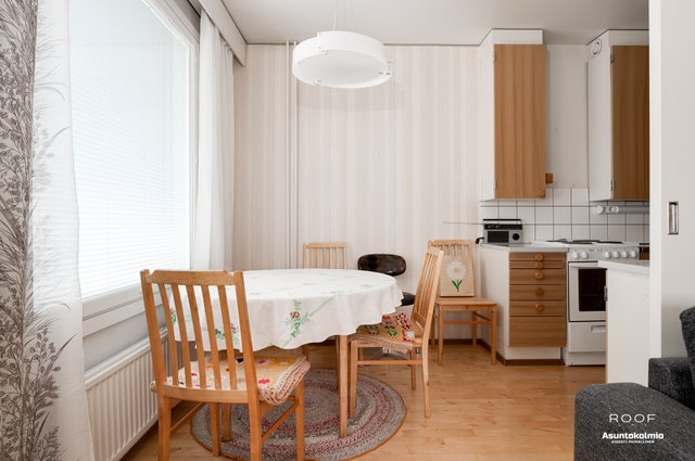 - Varustus: Jääkaappi/pakastin, sähköliesi, pöytätasot, kaapistot.