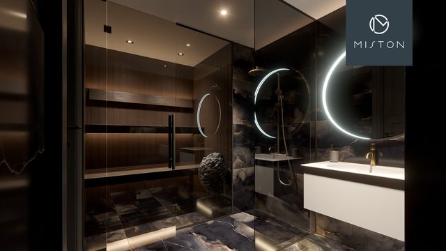 - Pesukoneliitäntä, wc-istuin, suihku, allaskaappi, ja pesuallas