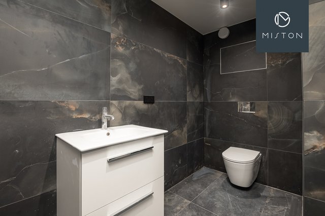 - Pesukoneliitäntä, wc-istuin, suihku, allaskaappi, ja pesuallas