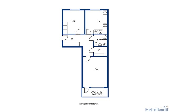 - Ei tarkistusmitattu. Pinta-alat saattavat tämän ikäisissä kohteissa (yhtiö rekisteröity ennen 01.01.1992) poiketa olennaisestikin asuinrakennusten nykyisten mittaustapojen ja standardien (SFS 5139) mukaan laskettavasta asuintilojen pinta-alasta. Pinta-ala voi siis olla edellä mainittua pienempi tai suurempi.