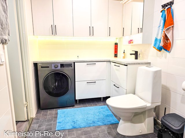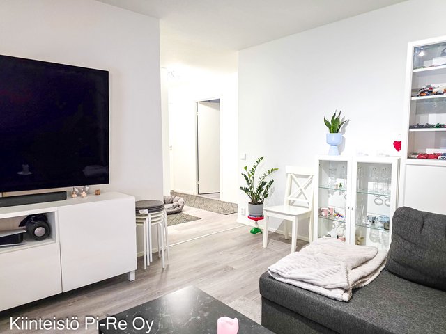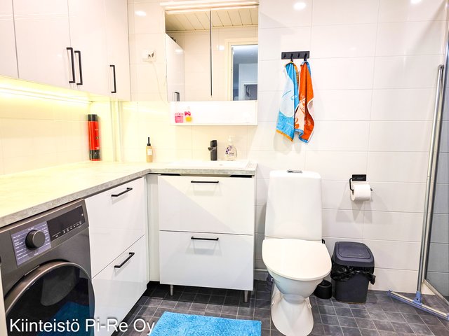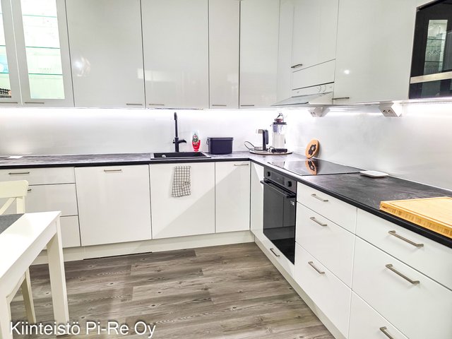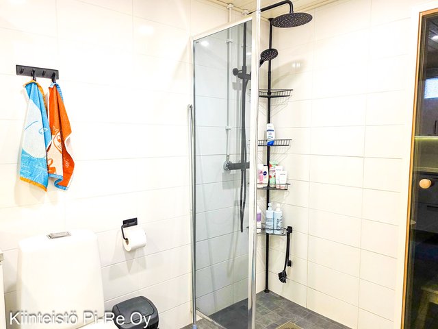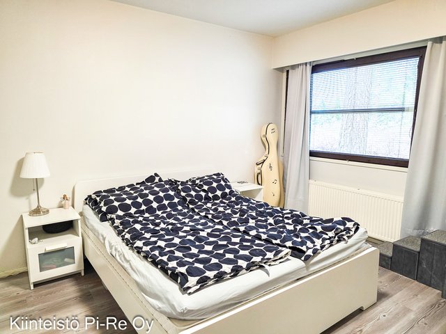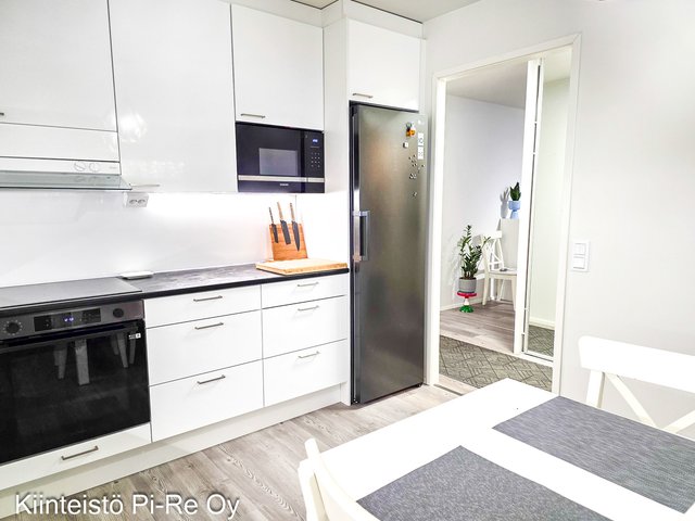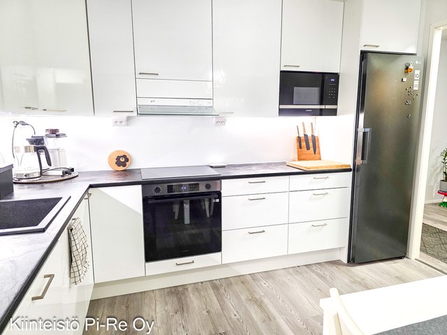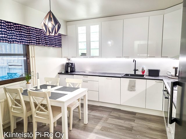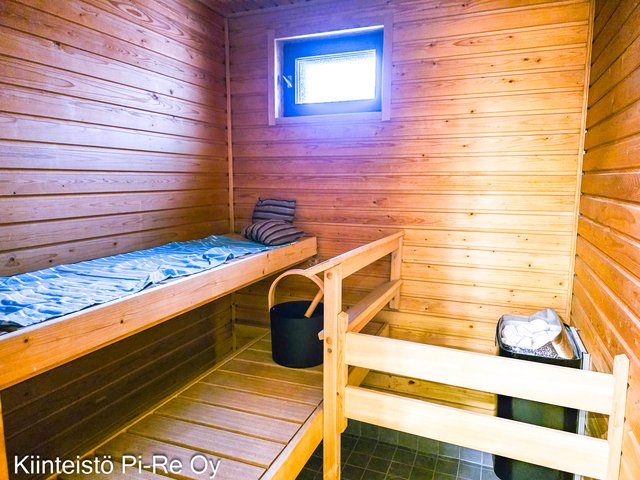 - KEITTIÖ: Keittiö remontoitu täydellisesti kodinkoneineen vuonna 2024. Lattiassa on vinyylilankku ja seinät ja katto maalattu. Kodinkoneina on jääkaappi, pakastin, astianpesukone, liesi ja liesituuletin. OLOHUONE: Olohuoneen lattiassa on vinyylilankku, seinät maalattu/tapetoitu ja katto maalattu. MAKUUHUONEET: Makuuhuoneiden lattioissa on vinyylilankku, seinät on tapetoitu/maalattu ja katot on maalattu. Aikuisten makuuhuone on yhtä iso kuin olohuone ja seinän mitalta kaapistoa. Pienemmässä huoneessa myös kaapisto. SAUNAOSASTO: Asunnossa oma siisti sauna, jossa seinät ja katto paneloitu ja lattiassa laatta. Sähkölämmitteinen kiuas. Kiuas ja lattia uusittu 2024. PESU / WC-TILAT: Upea pesuhuone. Pesutilat remontoitiin myös 2024, jolloin asennettiin vesieriste, laatat, kaakelit seiniin, paneelikatto, lattialämmitys sekä myös uusittiin kalusteet. Samalla kertaa asennettiin pesutiloihin uudet komposiittiputket. PARVEKE / TERASSI: Sisäänkäynnin yhteydessä on terassi grillaukseen ja ruokailuun, joka on katettu valokatteella. PIHA: Sisäänkäynnin puolella on piha-alue, jossa katettu ruokailu ja grillausalue, nurmikenttää ja ulkovarasto. SÄILYTYSTILAT: Huoneistossa on reilusti kaappitilaa, makuuhuoneissa ja eteisessä, lisäksi on ulkovarasto.