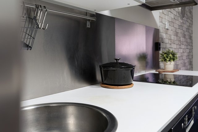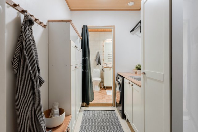 - Pesukoneliitäntä, pesuallas, pöytätaso, pyykkikaapit, ja tila pesutornille