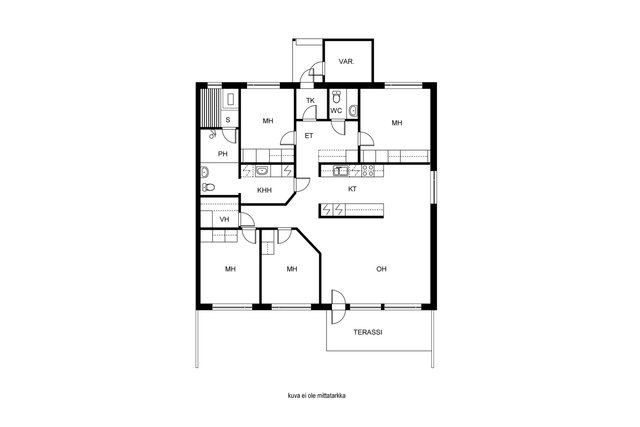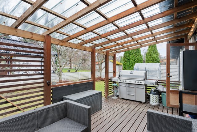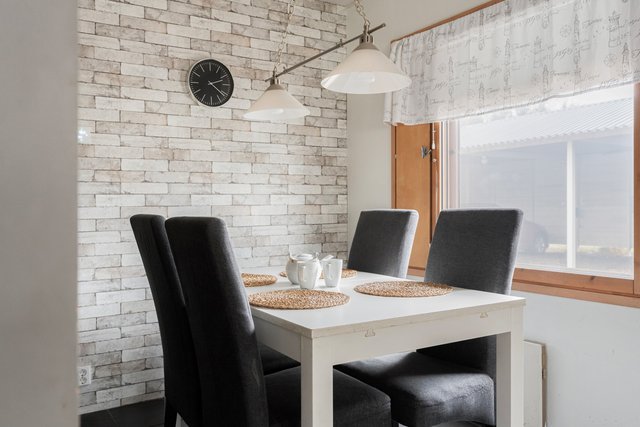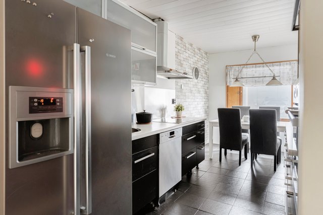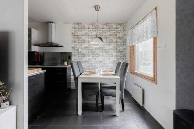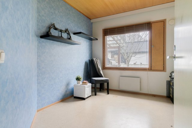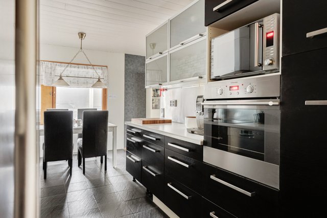 Keittiö on kokenut täydellisen remontin, jonka yhteydessä sinne on lisätty käytännöllinen laattalattia lattialämmityksellä – arjen mukavuutta parhaimmillaan. Tämän yksitasoisen kodin pohjaratkaisu on toimiva ja joustava, ja tilat muovautuvat helposti isommankin perheen tarpeisiin. Makuuhuoneet ovat mukavan kokoisia, ja kodinhoitohuone sijaitsee kätevästi kylpyhuoneen yhteydessä.