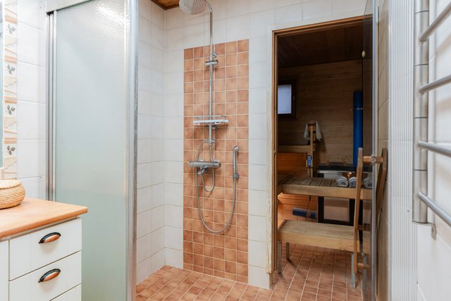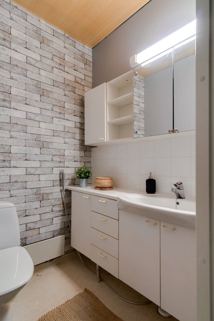 - WC-istuin, suihku, suihkuseinä, lattialämmitys, peilikaappi, allaskaappi, pesuallas, ja bidee-suihku