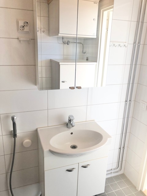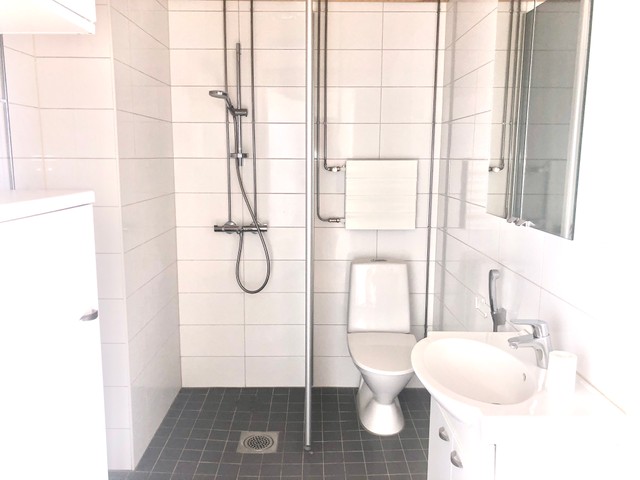 - WC-istuin, suihku, lattialämmitys, allaskaappi, pesuallas, peilikaappi, ja pesukoneliitäntä