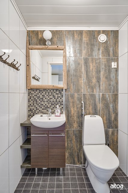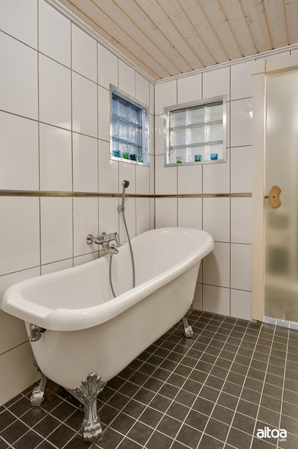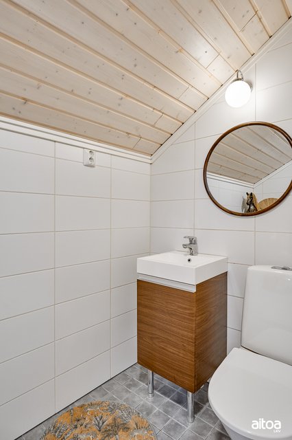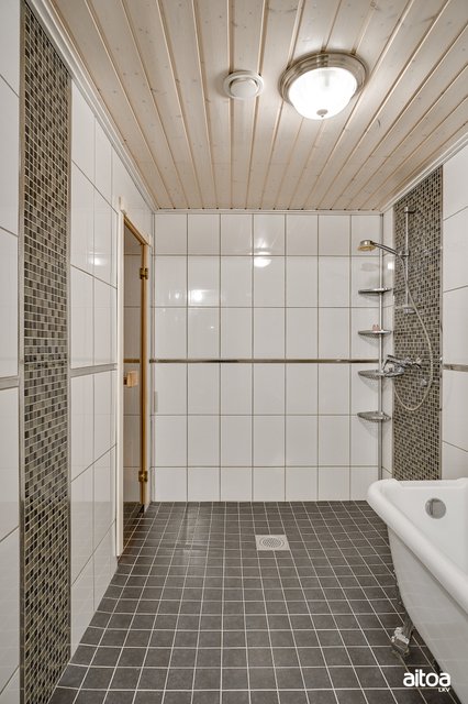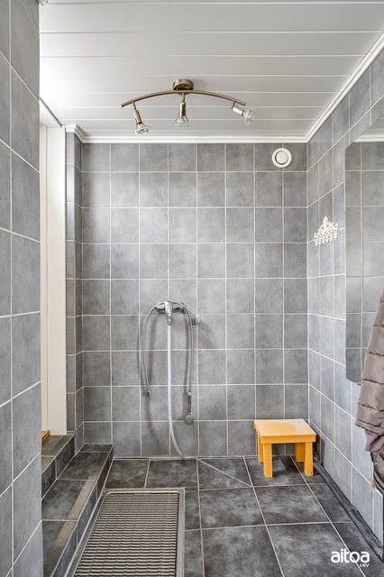 - Asuinkerroksessa kylpyhuone, jossa suihku, wc istuin, peili, pesuallas, allaskaappi, pesukoneliitäntä. Kellarikerroksen suihkuhuoneessa suihku, tassuamme.