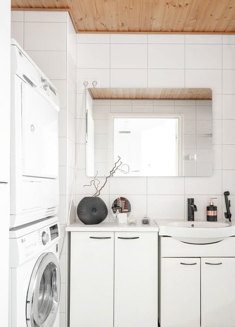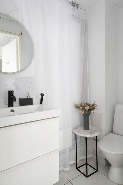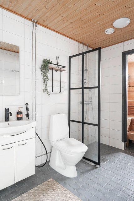 - WC-istuin, suihku, suihkuseinä, pesukoneliitäntä, lattialämmitys, peili, pesuallas, allaskaappi, ja bidee-suihku