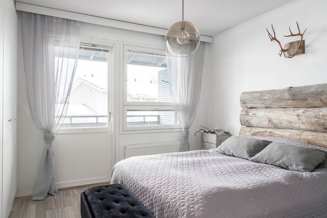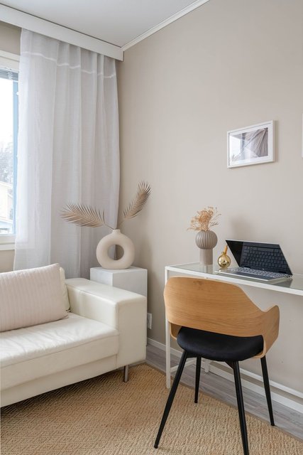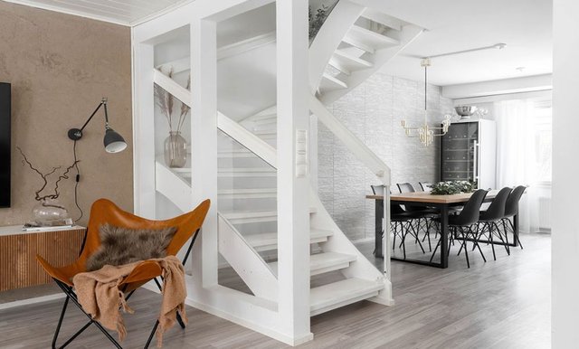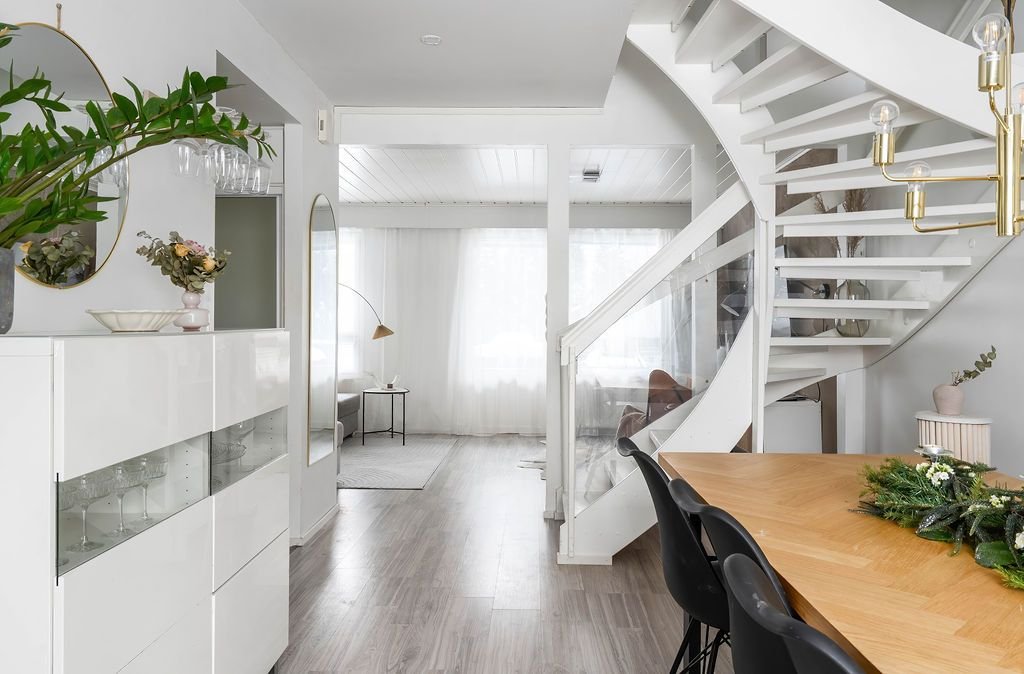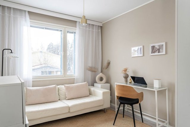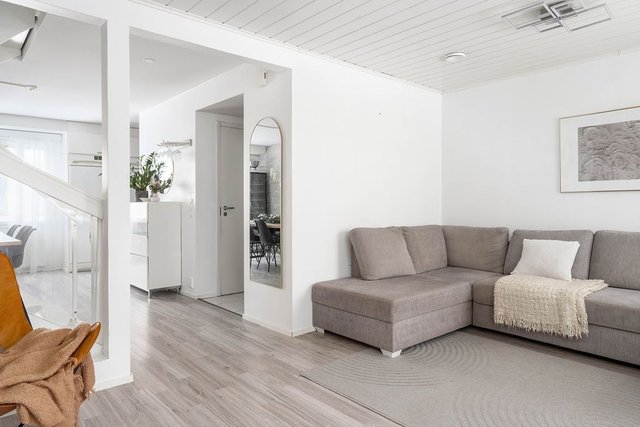Toimiva pohjaratkaisu. Alakerrassa keittiö, ruokailutila, erillinen WC ja valoisa olohuone josta käynti omalle katetulle terassille. Lisäksi takapihalta löytyy. mukavan kokoinen nurmikkopiha. Keittiössä hyvin kaappi- ja tasotilaa. Yläkerrassa kolme makuuhuonetta, joista suurimmassa oma parveke. Kylpyhuone löytyy asunnon toisesta kerroksesta sekä tyylikäs ja tunnelmallinen remontoitu sauna.