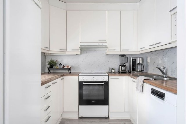 - Jääkaappi, erillinen pakastin, uuni, liesi, liesituuletin, ja astianpesukone