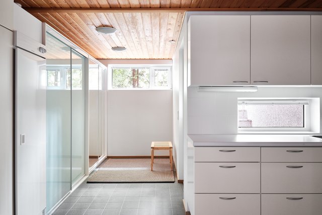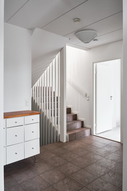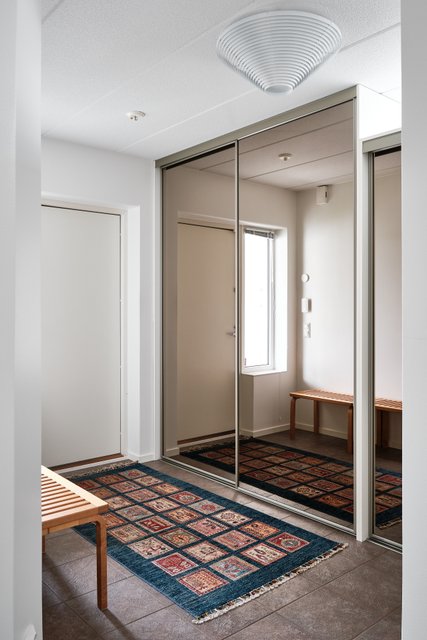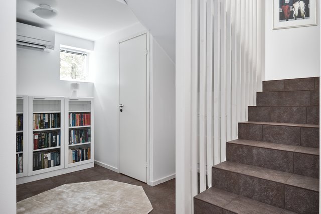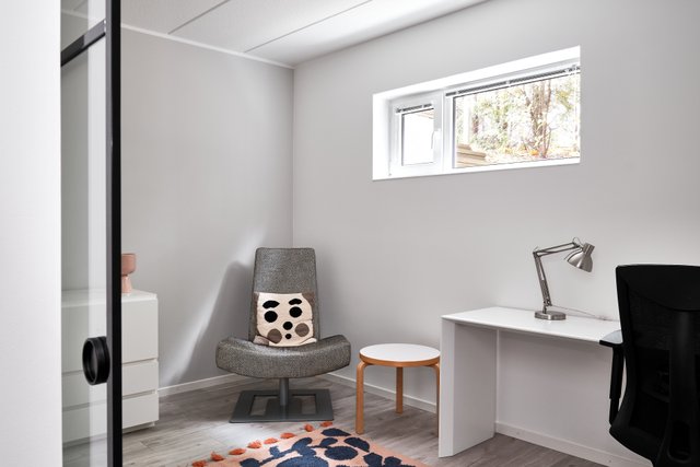 - Askarteluhuone, joka toimii nyt työhuoneena mutta tarvittaessa myös makuuhuoneena Pieni ikkuna, sälekaihtimet. Ikkunalauta laattaa. Lattia vinyyliä. Eteinen, jossa isot kaapistot peililiukuvoin. Alakerran aula ja tekninen tila.