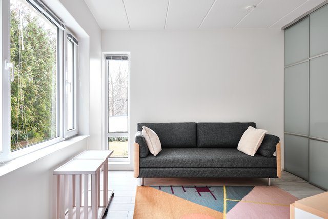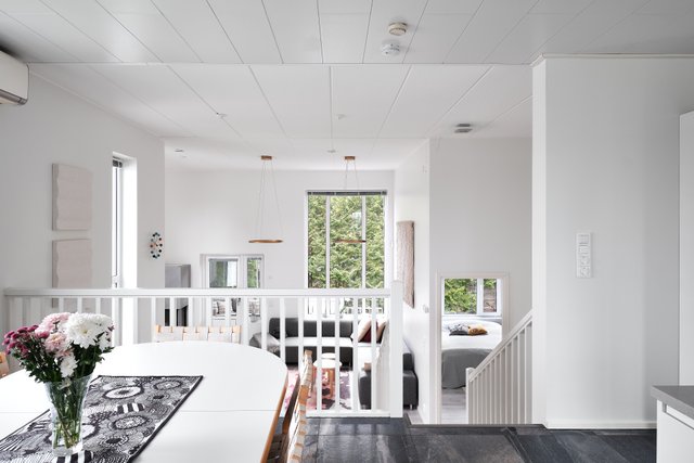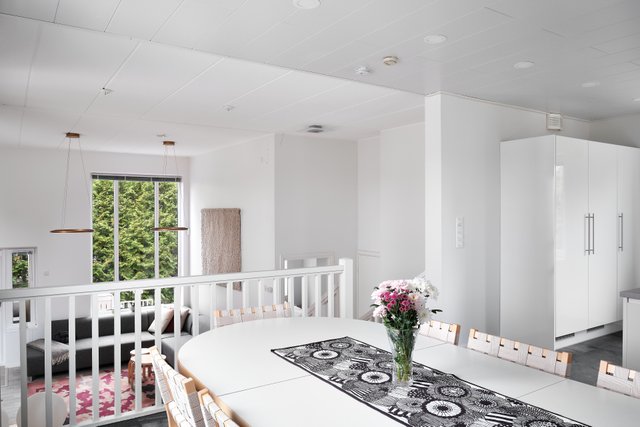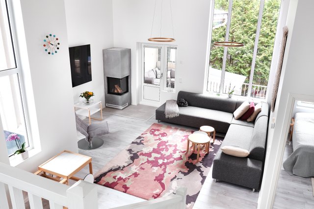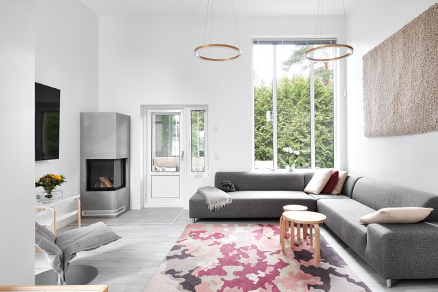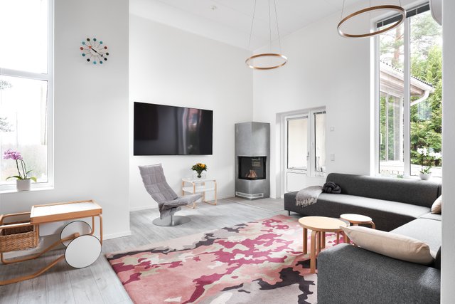 Olohuoneen korkea katto ja suuret ikkunat tuovat upean ilmeen ja valoa. Kaunis kiertoilmatakka luo kodikasta tunnelmaa. Olohuoneesta on käynti lasitetulle parvekkeelle ja helppohoitoiselle takapihalle. Keittiöstä on myös näkymä olohuoneeseen.