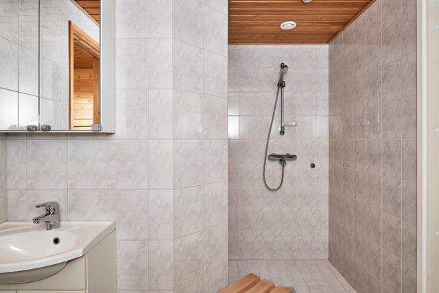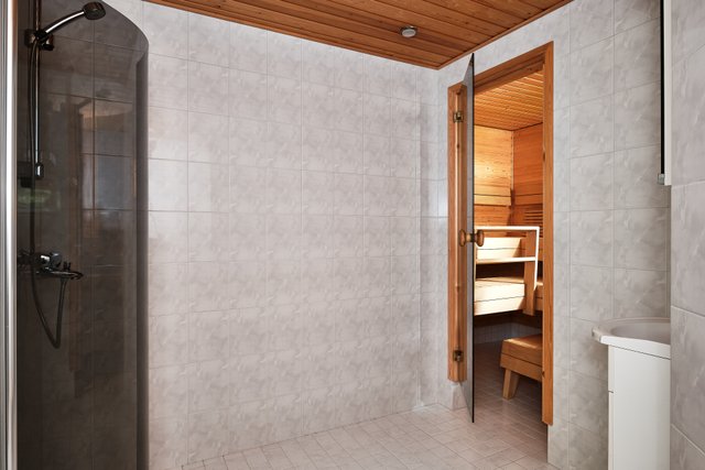 - Pesuhuone/saunan yhteydessä: kaksi suihkua, suihkuseinä, käsienpesuallas, allaskaapisto, peilikaappi. Yläkerta: wc-istuin, käsienpesuallas, allaskaapisto, peilikaappi, suihku, suihkukaappi tummalla Techglass-suihkuseinällä. Ikkuna.