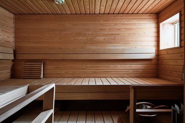 - Ikkunallinen sauna, sähkökiuas, tumma lasiovi.