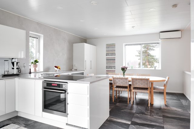 Keittiö on uusittu vuonna 2017 ja se on varustettu laadukkailla Siemensin kodinkoneilla sekä tyylikkäillä kivitasoilla. Keittiösaareke ja tilava ruokailutila tekevät tästä kodin sydämen, jossa on ilo kokata ja viettää aikaa perheen ja ystävien kanssa.