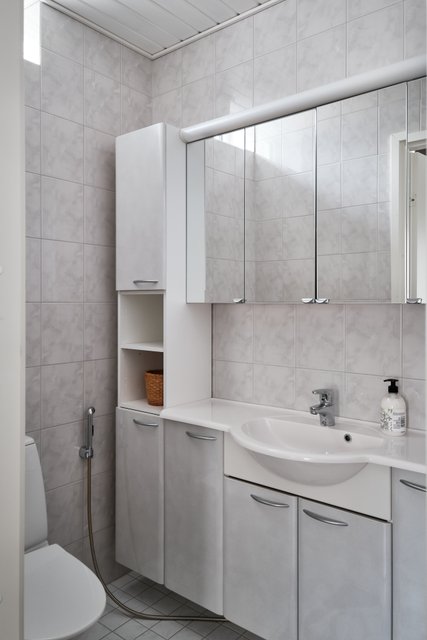 - Alakerrassa kaksi erillistä wc:tä. Wc-istuin, käsienpesuallas, allaskaapisto, bidee-suihku, peilikaapisto.