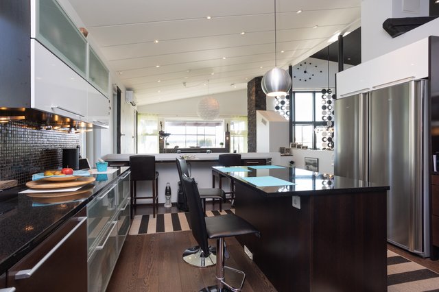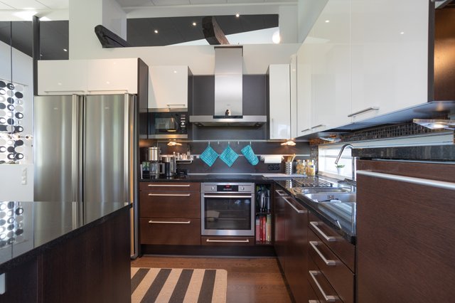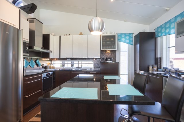 - Jääkaappi, erillinen pakastin, liesi, astianpesukone, mikroaaltouuni, liesituuletin, keittiösaareke, ja uuni