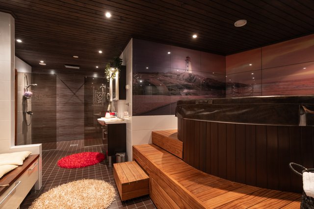 Källarvåningen har egen ingång, tvättstuga, arbetsrum, allrum med eldstad samt en lyxig spa-avdelning med jacuzzi, bastu och duschar. Cirka 50 m² yta passar perfekt som gym, hobby- eller arbetsrum.