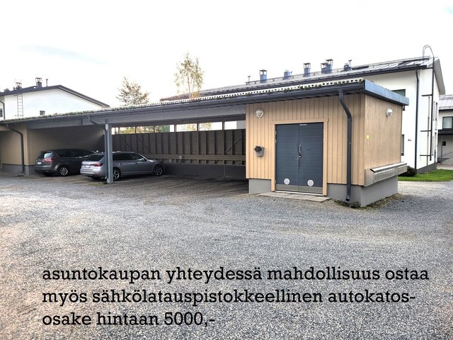 - mahdollisuus ostaa latauspistokkeellinen autokatospaikka AK 10 erillisenä osakkeena 5000,-. Autokatososake vastike 27,-/kk. Säköauton lataus ennakko 30,-/kk, tasausmaksu 0,17 €/kWh