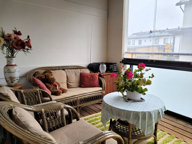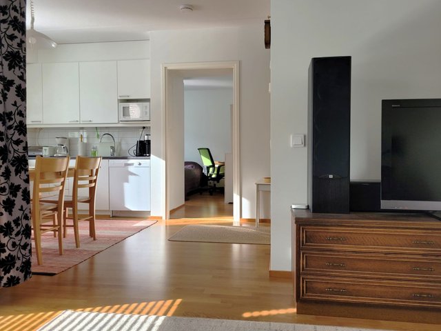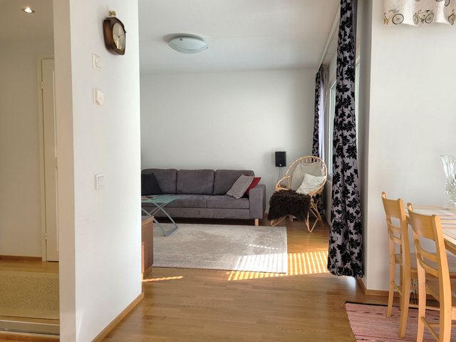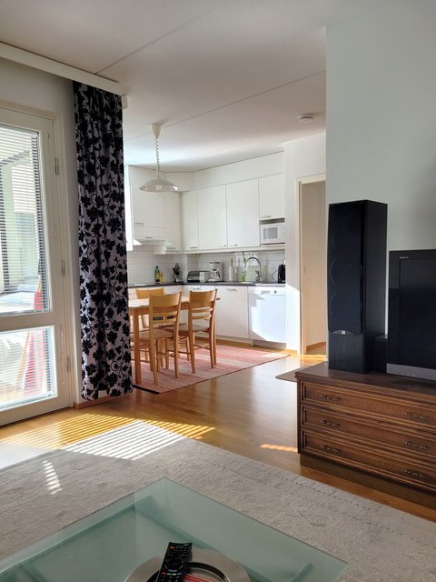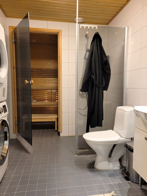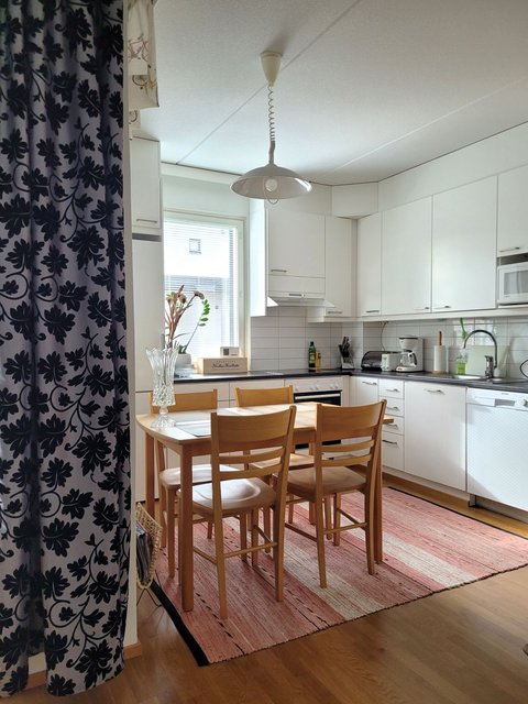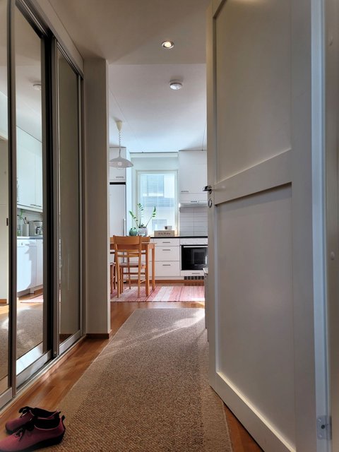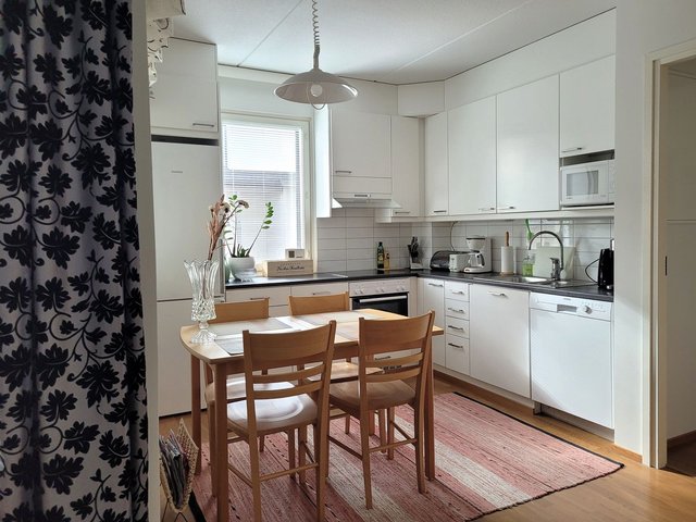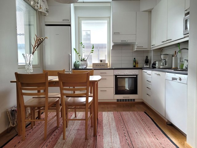 Tilavanoloinen keittiö on varustettu nykyaikaisilla kodinkoneilla ja ruokapöydälle on hyvin tilaa. Makuuhuoneessa ja eteisessä reilusti säilytystilaa. Omassa saunassa löylyttelet, kun tahdot ja fiksusti toteutettuun kylpyhuoneeseen mahtuu hyvin myös pyykinpesutorni.