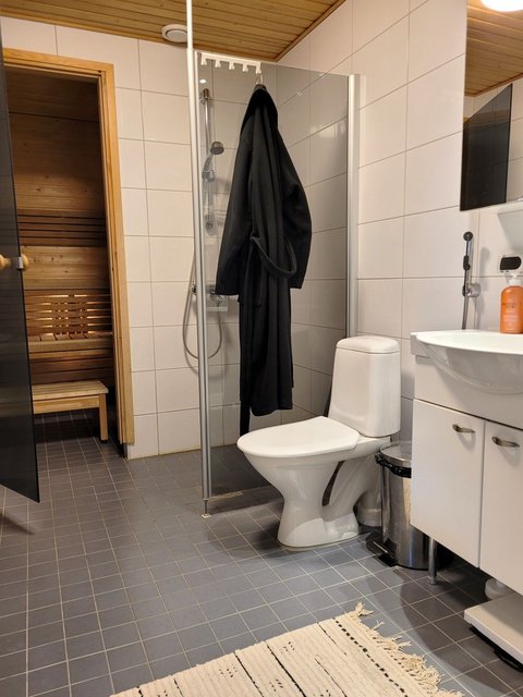 - WC-istuin, suihku, pesukoneliitäntä, peilikaappi, lattialämmitys (vesikiertoinen), pesuallas, ja allaskaappi