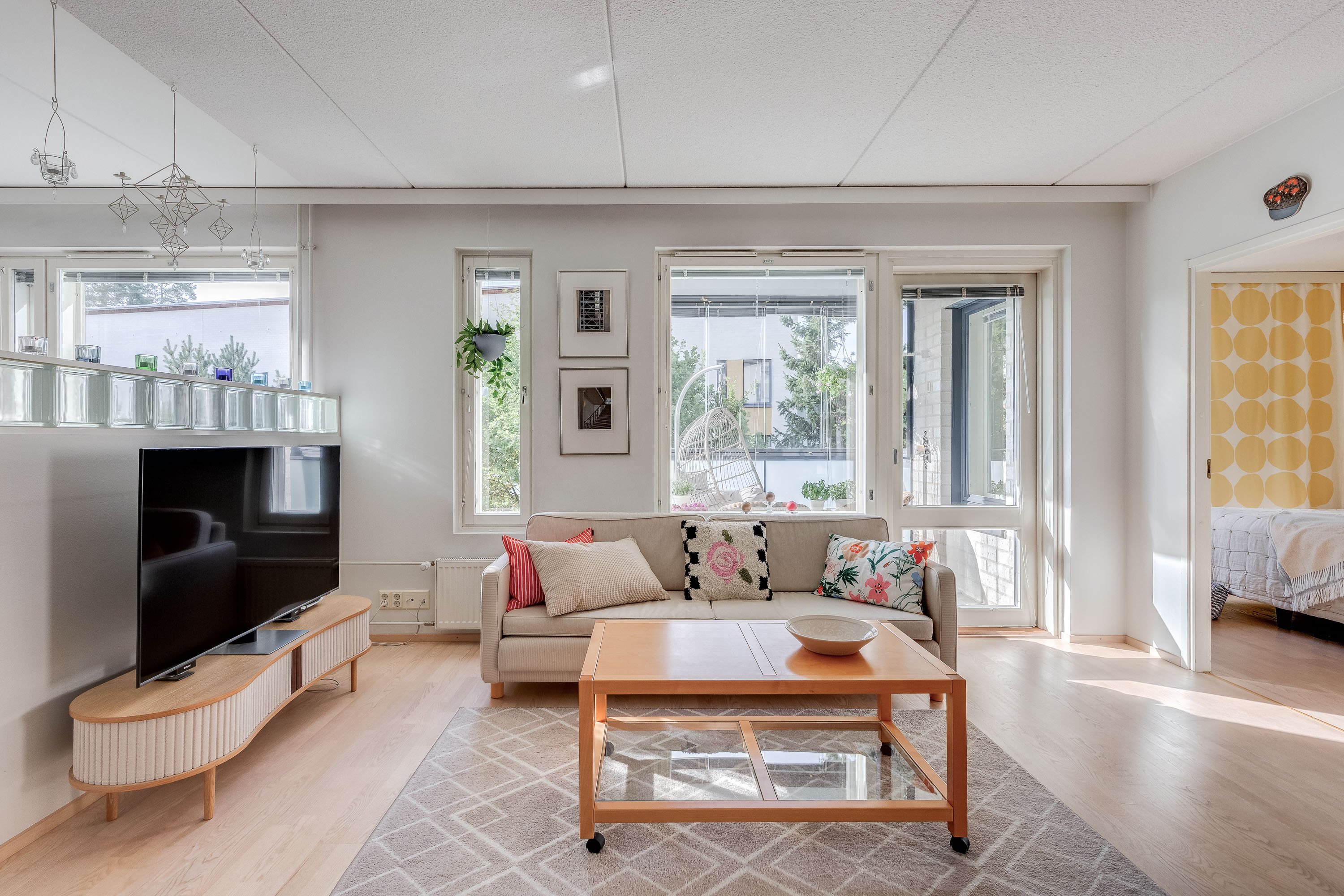 Todella ihastuttava, vaaleasävyinen kulmahuoneisto, johon tulvii valoa kolmeen suuntaan avautuvista ikkunoista. Tässä kolmiossa on harvinaisen toimiva pohjaratkaisu - säilytystilaa on runsaasti, erillinen wc, hyvänkokoiset makuuhuoneet ja ikkunalliset sauna ja kylpyhuone. Huoneisto ikäänkuin avautuu yhdellä vilkaisulla eikä hukkaneliöitä ole.