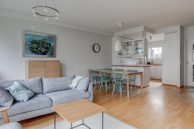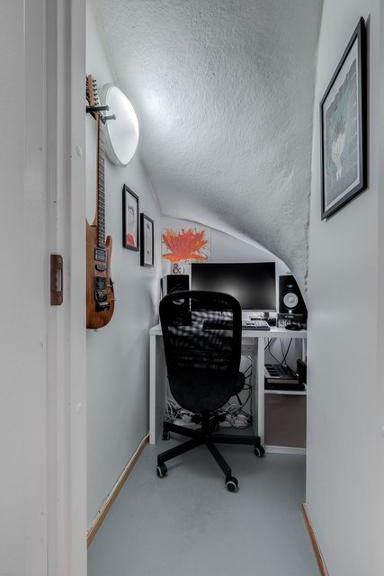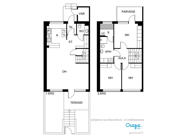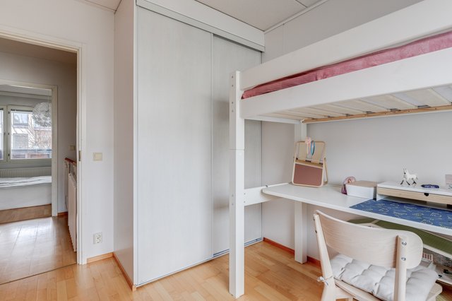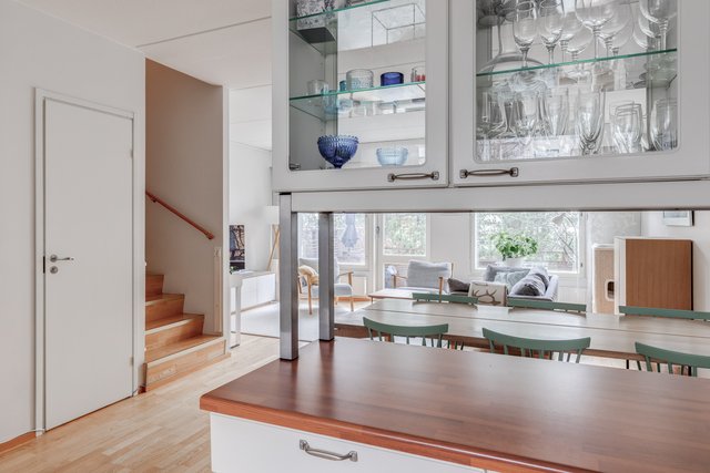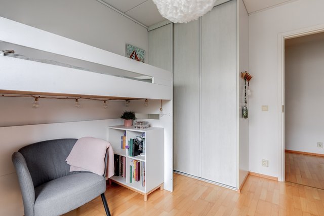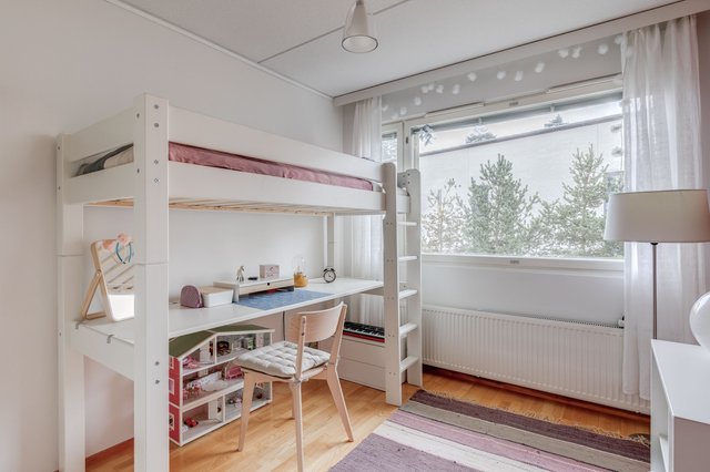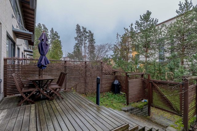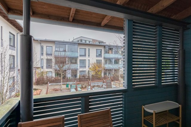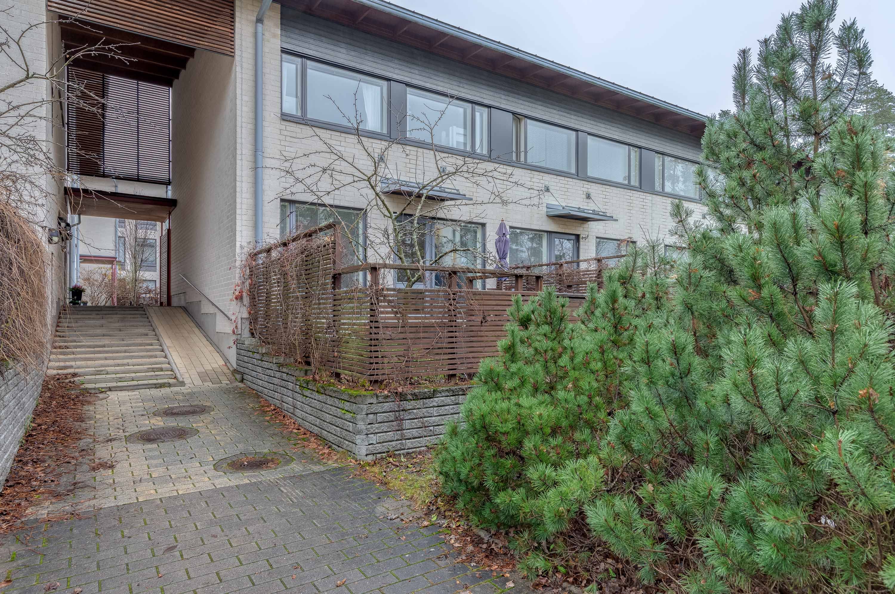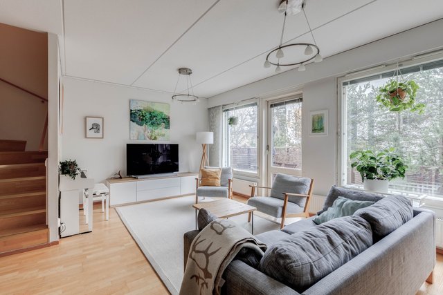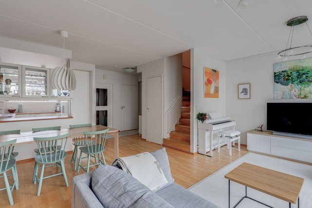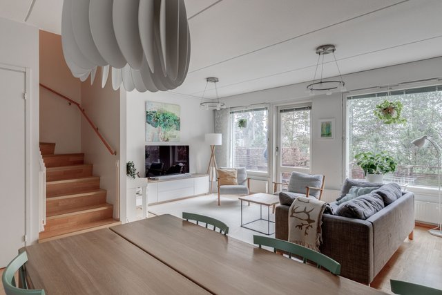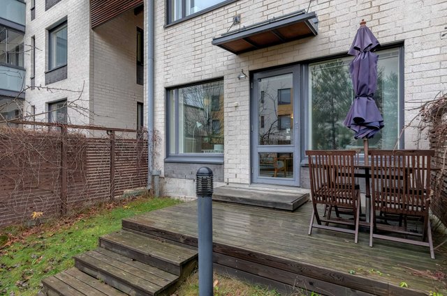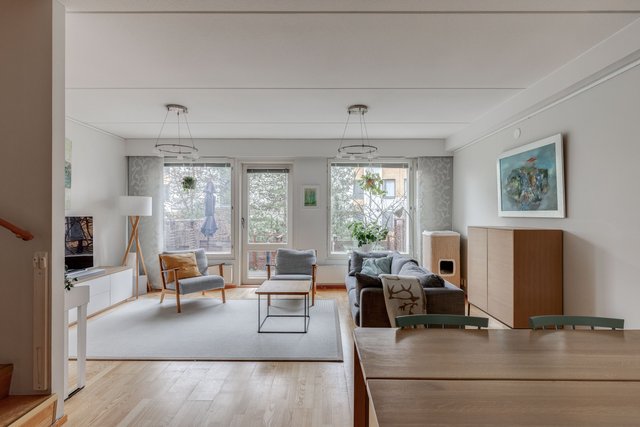 Tässä neljän huoneen asunnossa on klassinen pohja, jossa olohuone ja keittiö sekä pikku-wc sijaitsevat alakerrassa ja makuuhuoneet sekä saunaosasto yläkerrassa. Katoksellinen sisäänkäynnin yhteydessä on oma ulkovarasto. Olohuoneesta on käynti aurinkoiselle omalle pihalle, joka on hyvin vehreä omenapuineen ja villiviineineen. Portaiden alla olevaan tilaan on kekseliäästi sisustettu toimiva etätyöpiste, mutta tilan voi käyttää myös varastointiin. Eteisessä on hyvin kaappitilaa peililiukuovien takana. Myös kaikissa makuuhuoneissa on liukuovelliset vaatekaapit.