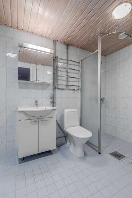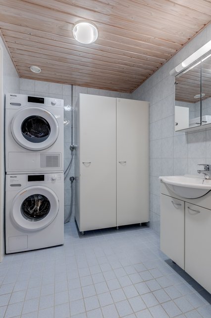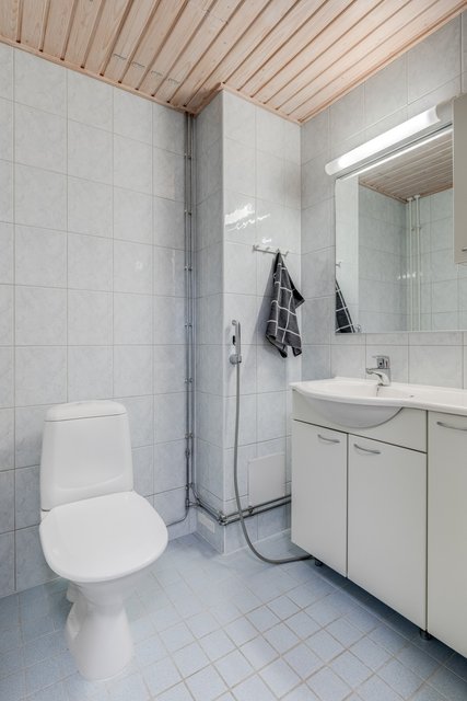 - WC-istuin, suihku, suihkuseinä, pesukoneliitäntä, pesuallas, peilikaappi, allaskaappi, lattialämmitys, bidee-suihku, ja pyyhekuivain
