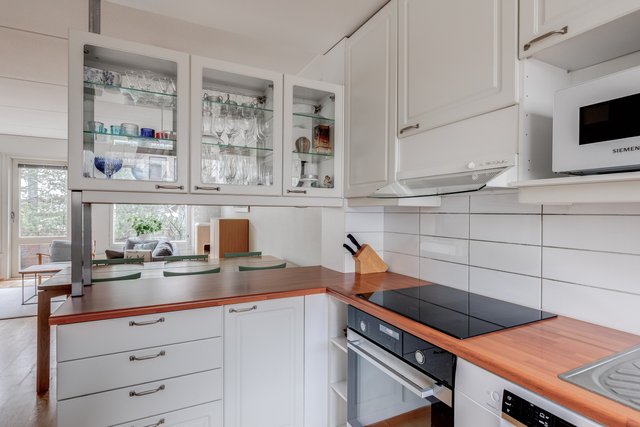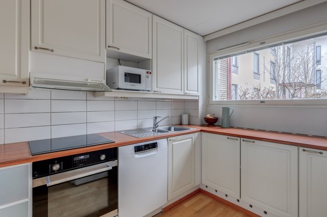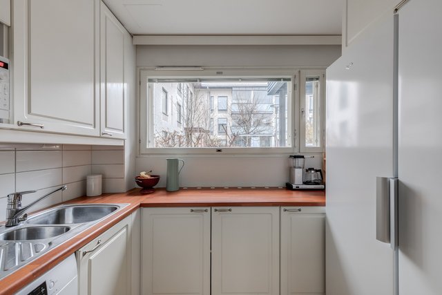 - Keittiöön uusittu kodinkoneita seuraavasti: apk 2019, uuni ja liesi 2020, jääkaappi ja pakastinkaappi 2024. Tasot laminaattia, kaapistot vaaleat ja alkuperäiset.