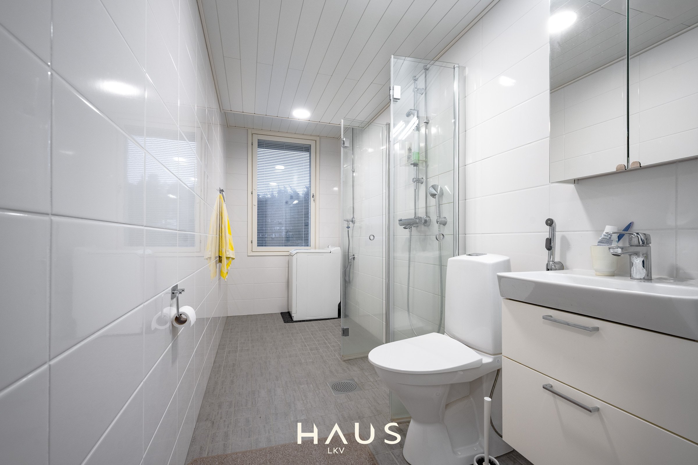 - WC-istuin, suihku, suihkuseinä, pesukoneliitäntä, lattialämmitys, peilikaappi, pesuallas, allaskaappi, ja bidee-suihku