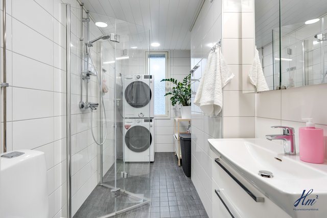 - WC-istuin, suihku, suihkuseinä, pesukoneliitäntä, lattialämmitys, peilikaappi, pesuallas, bidee-suihku, ja allaskaappi