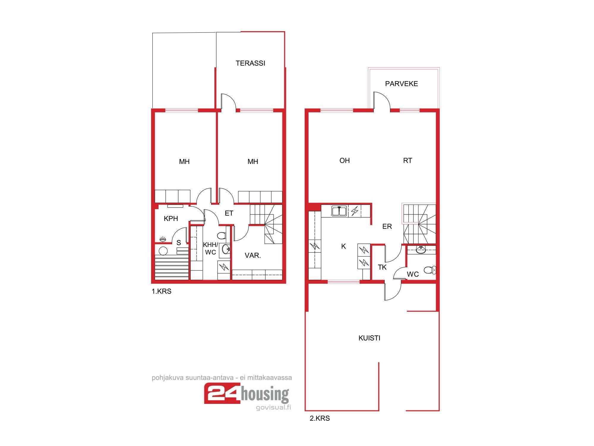 Tämä on siisti kaksikerroksinen asunto, jossa oleskelutilat ja avokeittiö ovat yläkerrassa ja makuuhuoneet ja saunaosasto alakerrassa. Molemmissa kerroksissa on oma WC. Lisäksi alakerrassa on kodinhoitohuone sekä tilava varasto-/vaatehuone joka taipuu tarvittaessa monenlaiseen käyttöön. Yläkerrassa on parveke ja huoneistoon kuuluu lisäksi sisäänkäynnin puoleinen tilava kuisti sekä alakerran aidattu terassi.