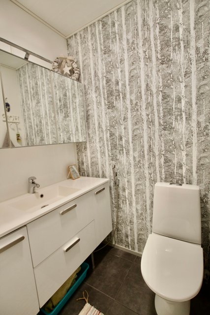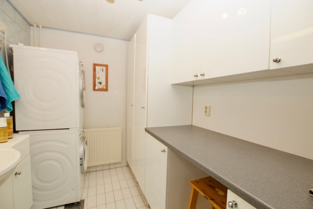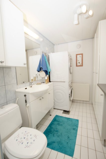 - Pesukoneliitäntä, pesuallas, pyykkikaapit, pöytätaso, tila pesutornille, ja pyyhekuivain / seinäpatteri