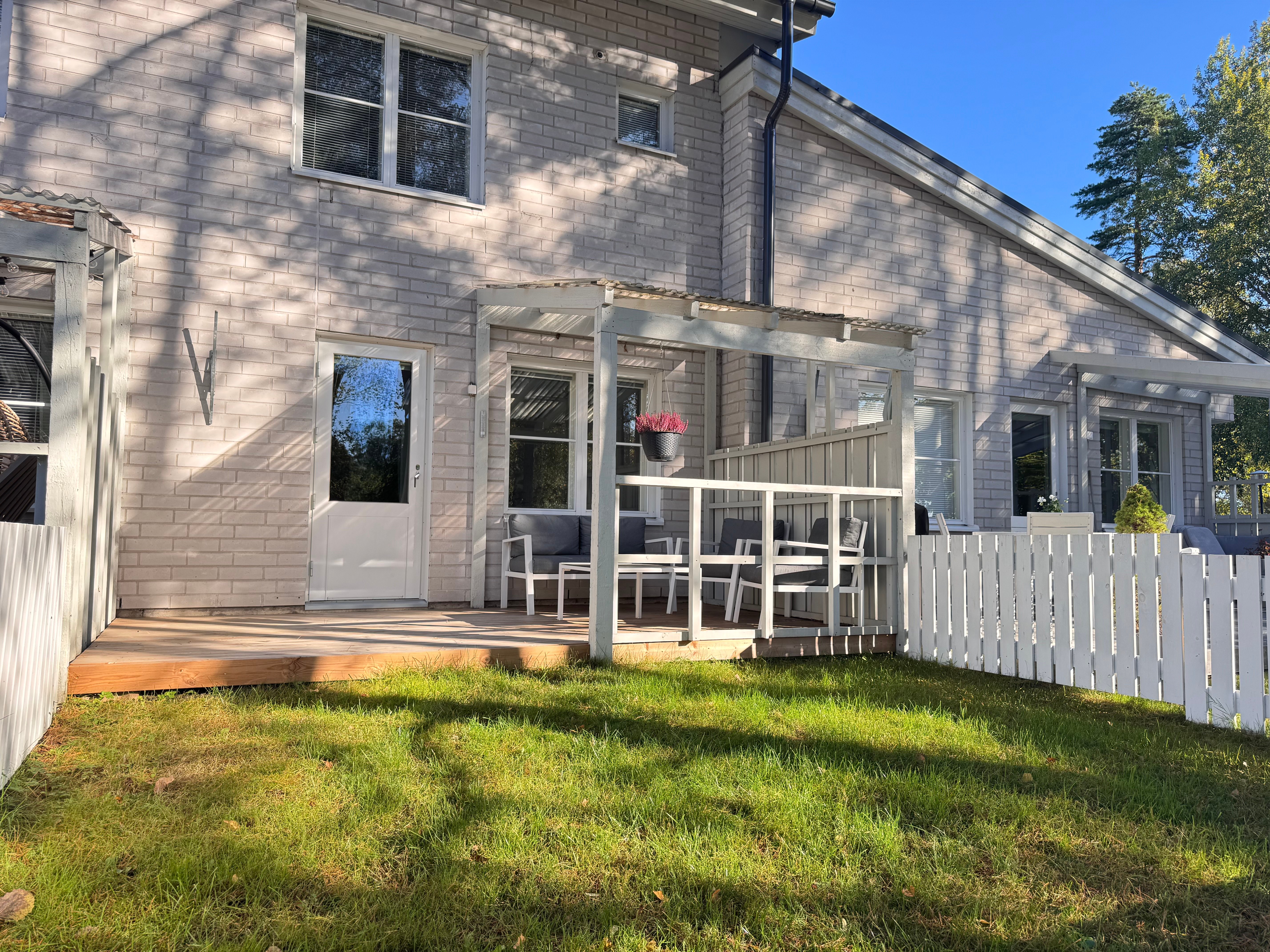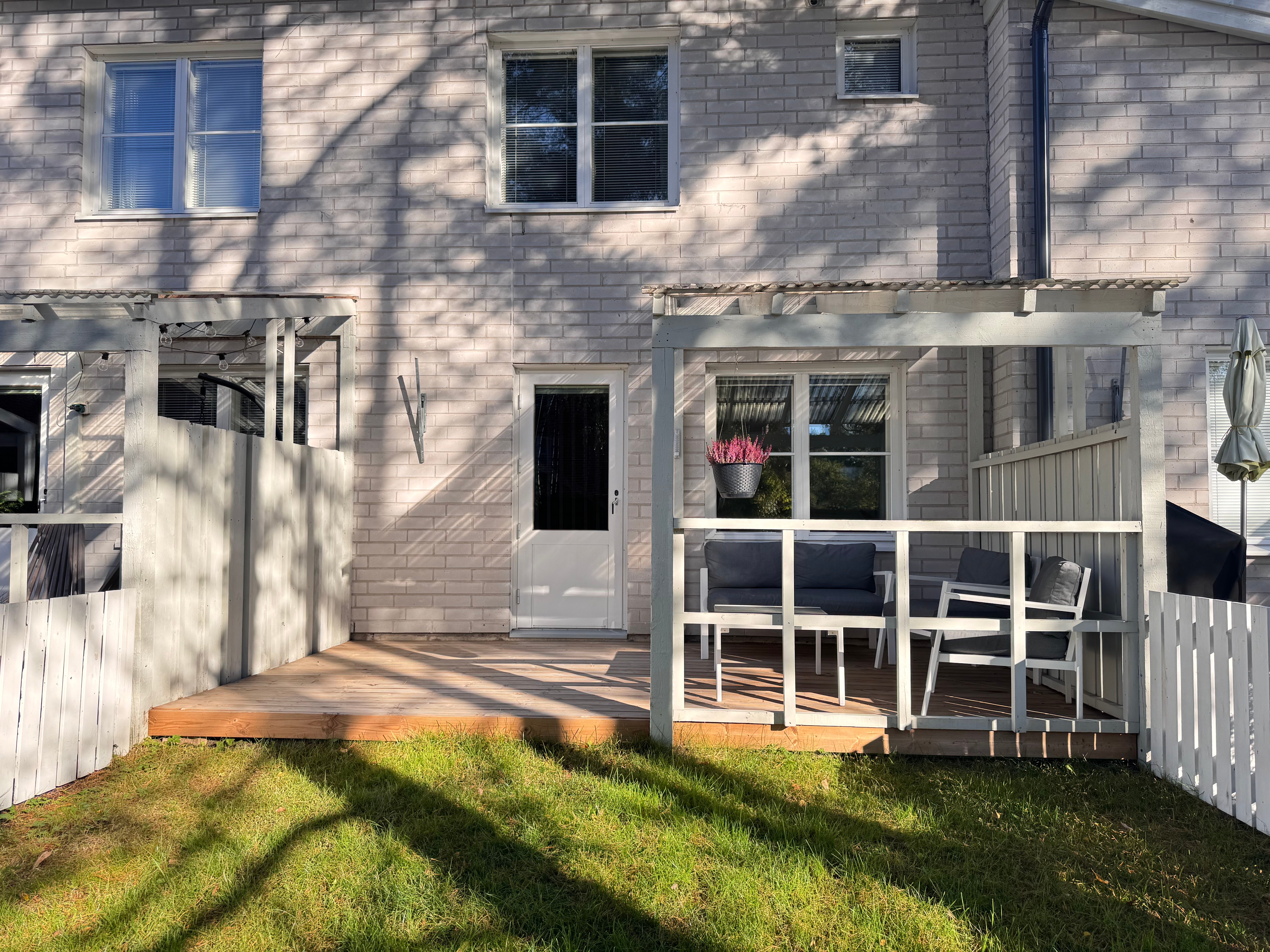 Valoisa rivitalon kolmio omalla saunalla, pihalla ja terassilla.
