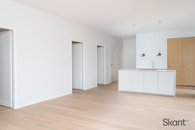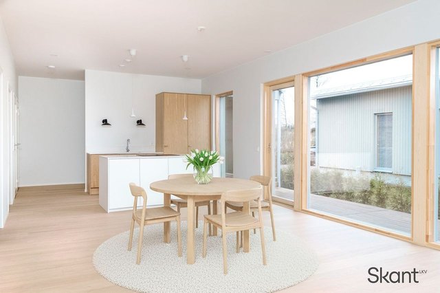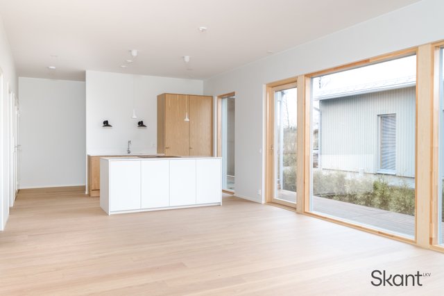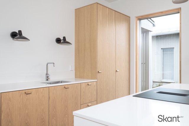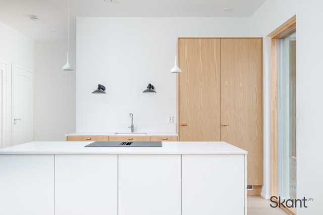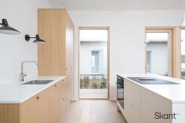 Kodin sydän on moderni, osittain puuviilupintainen keittiö, jossa on selkeälinjainen saareke, integroidut kodinkoneet ja reilusti kivipintaista laskutilaa. Keittiö avautuu saumattomasti ruokailutilaan ja olohuoneeseen, mikä tekee kokonaisuudesta erityisen toimivan ja miellyttävän arjen tarpeita ajatellen.